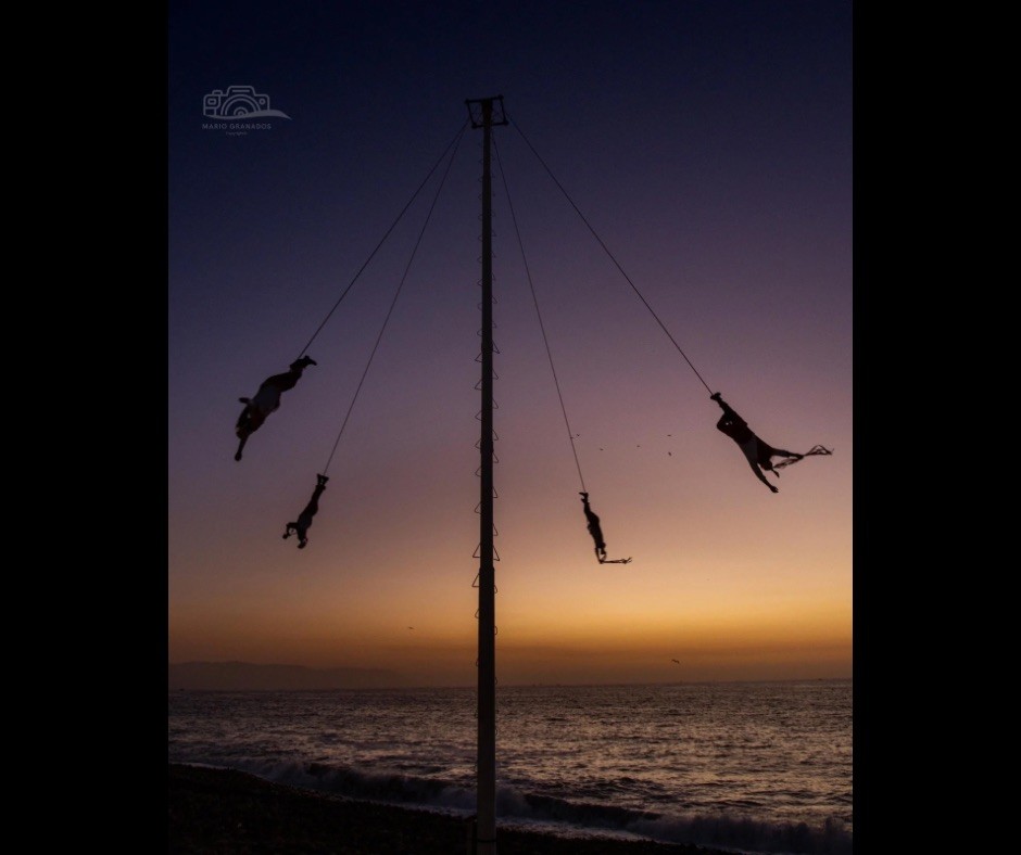 Suspendidos entre el firmamento y el mar, cuatro cuerpos descienden lentamente mientras el crepúsculo tiñe de oro y violeta la orilla. El poste se alza como un eje sagrado y las cuerdas trazan círculos invisibles sobre el horizonte. No es un espectáculo: es un diálogo antiguo que aún respira. En ese giro contenido, los voladores de Papantla recuerdan que la tierra escucha cuando el gesto nace del respeto.