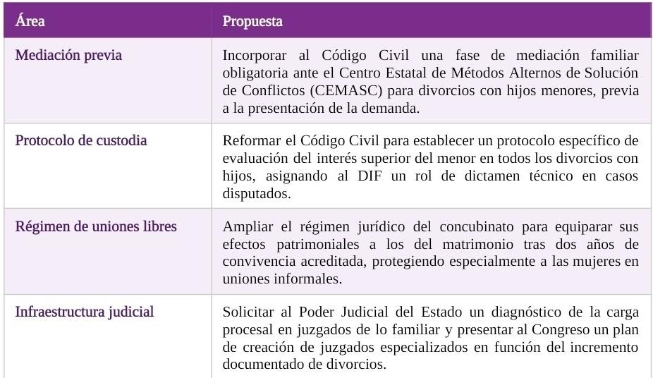 - Déficit de acompañamiento institucional. El Código Civil reformado no generó un servicio estatal de orientación jurídica y psicológica para cónyuges en proceso de separación. El Poder Judicial ofrece el procedimiento; no ofrece el entorno de apoyo que permita que el procedimiento sea una transición ordenada y no un trauma amplificado.