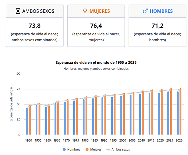 La esperanza de vida mundial en 2026 ronda los 73.8 años, con una brecha notable de 5.2 años donde las mujeres (76.4 años) viven más que los hombres (71.2 años). Los países con mayor longevidad (Japón, Mónaco, España) superan los 80-85 años, impulsados por buena atención médica, mientras que en regiones menos desarrolladas es significativamente menor. La humanidad avanza a un ritmo de un año más de esperanza de vida cada tres años
