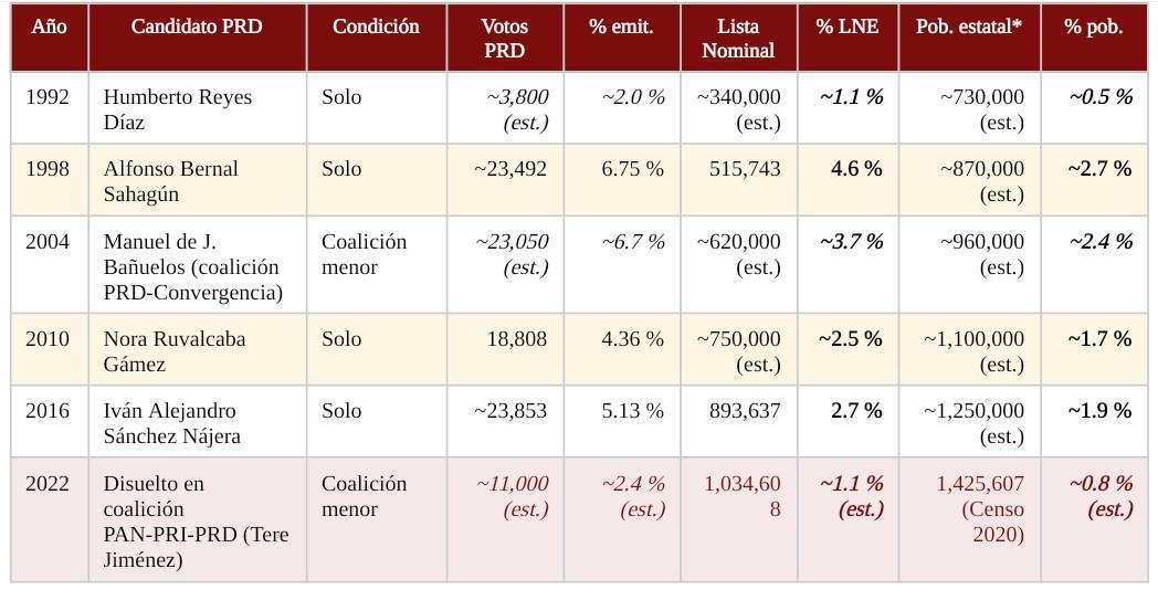 La tabla siguiente compila los resultados del PRD en cada elección de gobernador (1992–2022). Para 2004, la coalición PRD-Convergencia se presenta en conjunto dado que la fuente primaria no desagrega los votos por partido. Para 2022, el aporte del PRD dentro de la coalición PAN-PRI-PRD se estima con base en la caída documentada del 48% que registró el partido en ese proceso respecto a procesos anteriores, según el análisis publicado en Nexos. Las estimaciones se indican en cursiva.