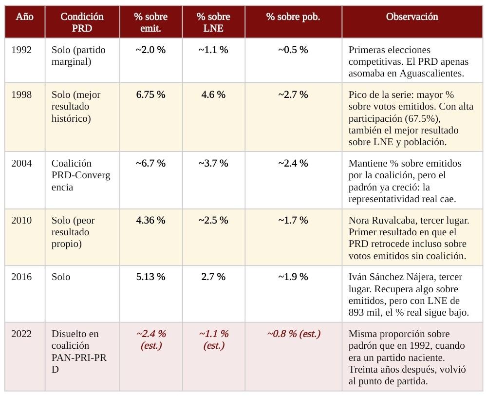Las cifras sobre Lista Nominal y población revelan lo que el porcentaje sobre votos emitidos encubría: el PRD nunca tuvo en Aguascalientes una base real superior al 4.6% del padrón, y ese pico lo alcanzó hace veintiocho años. Todo lo demás fue administrar la irrelevancia con más o menos dignidad, hasta que en 2024 la estructura nacional del partido dejó de existir formalmente. Para el análisis electoral de 2027 el PRD ya no es una variable. Es una nota al pie.