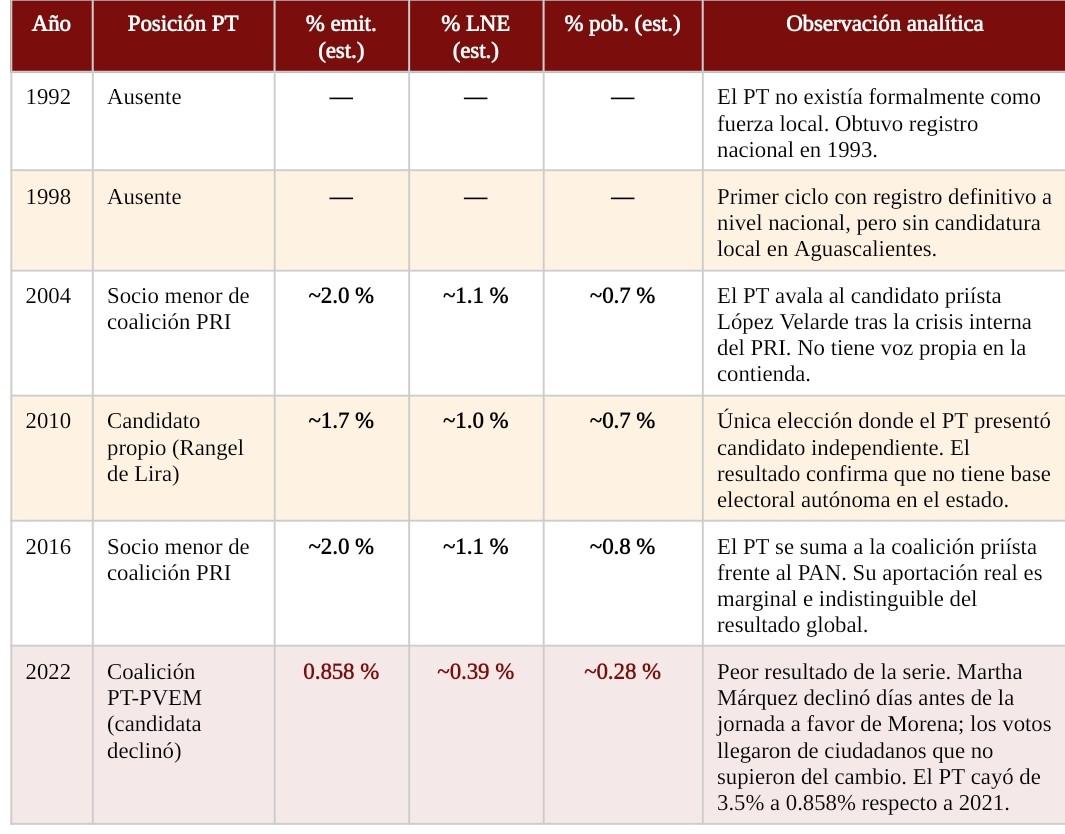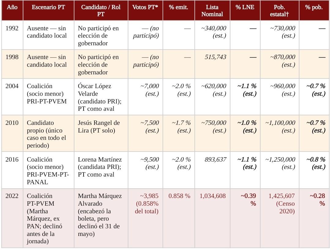 Una aclaración metodológica inicial: dado que el PT nunca tuvo candidatura propia visible en la mayoría de las elecciones, su rol fue el de partido accesorio en coaliciones priístas o en la aventura de 2022 con Martha Márquez, los datos de votos son en su mayoría estimaciones construidas a partir de los porcentajes totales de la coalición y la proporción histórica que el PT representa en esos bloques. Las estimaciones se indican explícitamente.