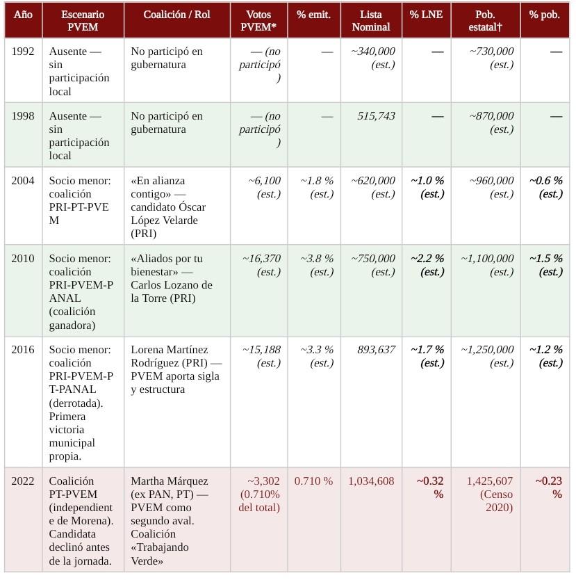 El pico estimado del PVEM en la gubernatura fue 2010, con aproximadamente 16 mil 370 votos atribuibles al partido dentro de la coalición ganadora. Sobre una Lista Nominal estimada de 750 mil electores, eso equivale al 2.2% del padrón. Es el único año de la serie en que el PVEM puede reclamar, con algún fundamento, haber contribuido a una victoria. En 2016 con una coalición más amplia de cuatro partidos, su aporte estimado fue similar en términos absolutos pero menor en proporción de padrón, el estado había crecido, y la coalición perdió de todas formas.