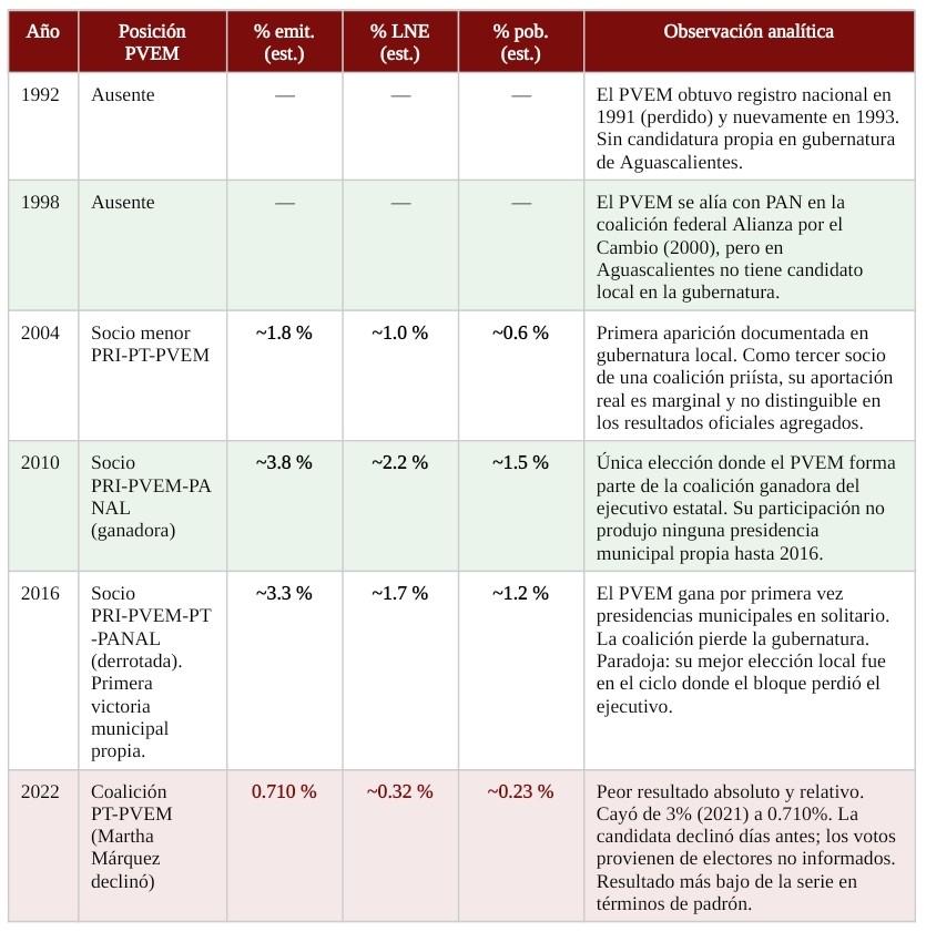 Durante doce años de 2004 a 2016, el PVEM fue parte de las coaliciones priístas en Aguascalientes. En 2004 como tercer socio de una coalición derrotada. En 2010 como parte de la única coalición que ganó la gubernatura en ese periodo. En 2016 nuevamente en una coalición derrotada por un margen estrecho. En los tres casos el PVEM no puso el candidato, no definió la agenda y no capitalizó los resultados en términos de representación en el ejecutivo estatal. Su ganancia fue institucional prerrogativas, visibilidad en la boleta, diputaciones de RP, no política.