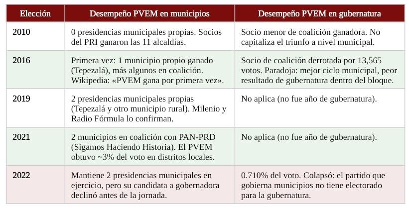 Esa dualidad, partido-satélite en el ejecutivo estatal, fuerza real en municipios rurales, no es una contradicción: es el modelo de supervivencia del PVEM. Gobierna donde puede ganar con pocos votos y estructura local, y en las elecciones grandes viaja en la boleta del partido que tenga más posibilidades. El problema es que ese modelo produce una representatividad inconsistente: los ciudadanos que votan por el PVEM en municipios rurales no necesariamente votan por él en elecciones de gobernador, y viceversa.