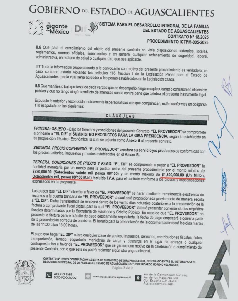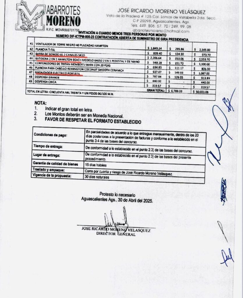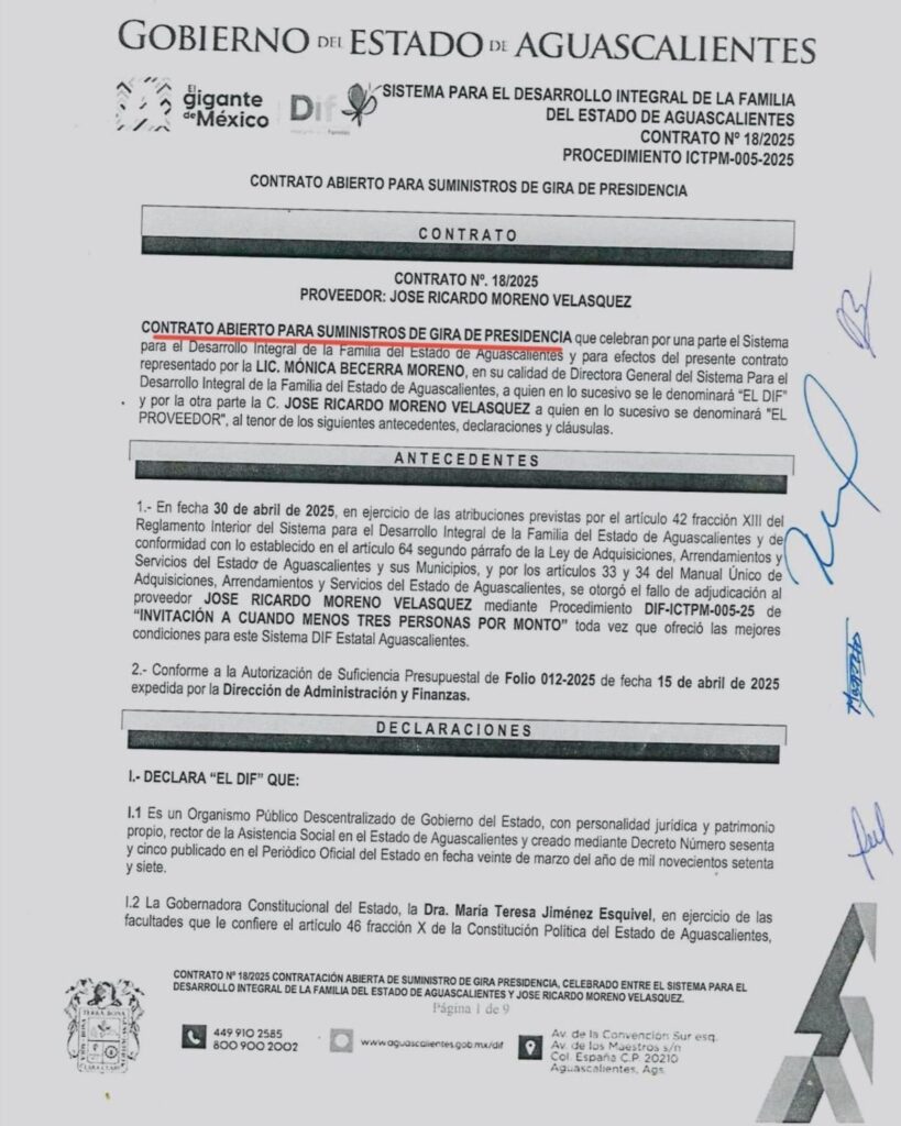 La entonces directora estatal del DIF Aguascalientes, agrega la nota, “no supo explicar en qué consistiría la supuesta gira que debía realizar con el dinero público malversado, pues se puede observar en el listado de artículos: planchas para el cabello, masajeadores eléctricos, juegos de alhajeros, pashminas, carteras para caballero, juegos de plumas, electrodomésticos y hasta una barra de sonido”, comprados al amparo del contrato 18/2025, procedimiento ICTPM-005-2025 (mostrado al final de esta columna), a José Ricardo Moreno Velásquez, director general de Abarrotes Moreno.