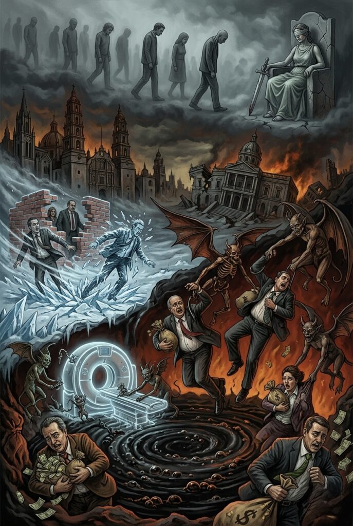 A la gente corrupta, a los de “cuello blanco”, los espera el castigo que imponen las leyes, pero también están los castigos del infierno. Y si aquí en la tierra los jueces no hacen su trabajo y nosotros las y los ciudadanos no exigimos justicia, entonces, hay que apelar al castigo divino. Para ellos, el infierno sin piedad alguna, y que allí vivan por toda la eternidad.
