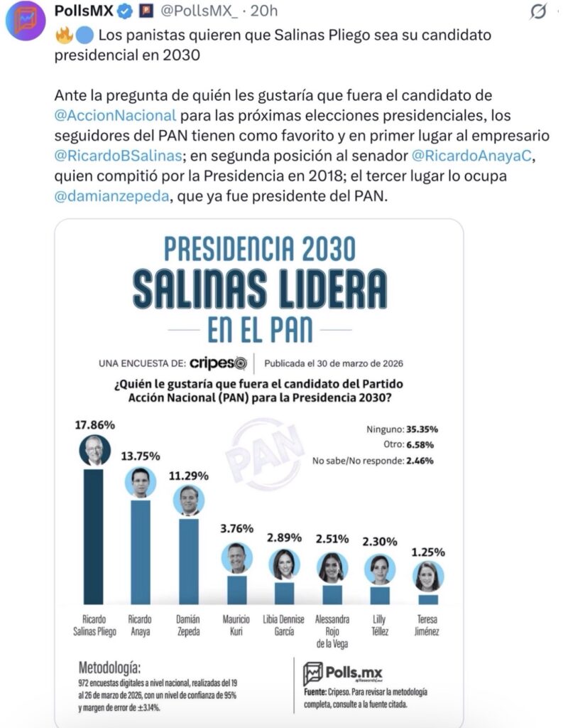 A la pregunta: “¿Quién le gustaría que fuera el candidato del Partido Acción Nacional (PAN) para la Presidencia en 2030?”. El 17.86% de los entrevistados responde que al empresario Ricardo Benjamín Salinas Pliego, presidente de TV Azteca. Le siguen Ricardo Anaya Cortés con 13.75% y Damián Zepeda Vidales con 11.29%.