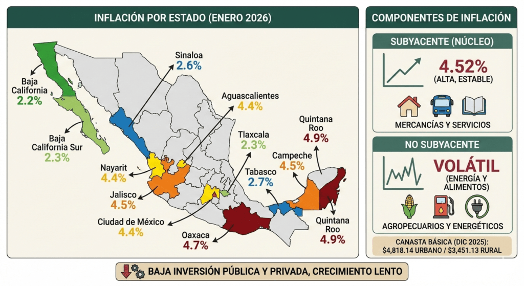 México Cómo Vamos, con datos oficiales destaca que, en enero de 2026, los estados con mayor inflación anual fueron Quintana Roo y Oaxaca con 4.9% y 4.7% respectivamente, seguidos por Campeche y Jalisco (ambos con 4.5%) y Ciudad de México, Nayarit y Aguascalientes, con una inflación anual de 4.4%. Las entidades con menor inflación anual fueron Baja California (2.2%), Baja California Sur y Tlaxcala con 2.3%, Sinaloa (2.6%), así como Tabasco (2.7%).