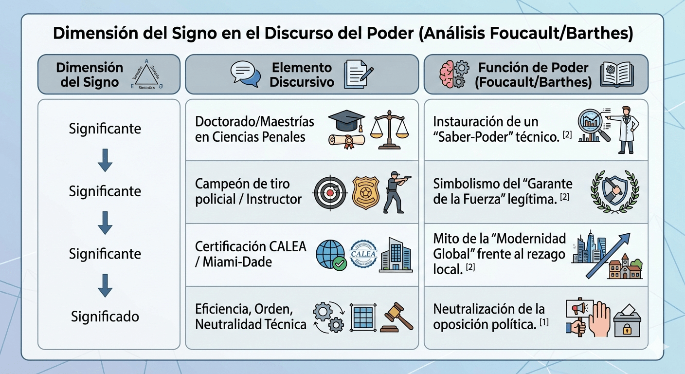 La biografía institucional de Alonso García está saturada de credenciales que funcionan como «mitemas» —unidades mínimas de significación mítica—. Su formación como Doctor en Ciencias Policiales y Seguridad Pública, sus condecoraciones al mérito policial y su certificación por la Comisión de Acreditación para Agencias de Aplicación de la Ley (CALEA) no son meros datos curriculares que el actor aporta en sus diferentes entrevistas, ante todo son mecanismos de legitimación que operan para «despolitizar» su nombramiento.2