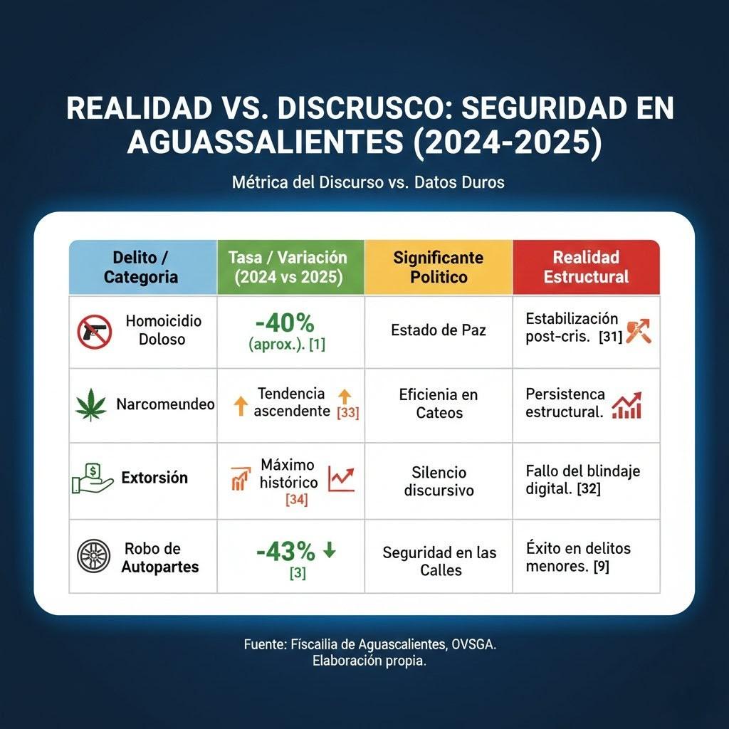 Para el analista estructuralista, las estadísticas no son hechos objetivos, sino signos que se interpretan dentro de un sistema de valores. El Fiscal Alonso García destaca que Aguascalientes fue el único estado en reportar un mes sin homicidios dolosos en noviembre de 2025, un «tema histórico» que se utiliza para reafirmar la eficacia del Blindaje.1 No obstante, los datos del Secretariado Ejecutivo (SESNSP) y de organizaciones como Integralia y el Observatorio Nacional Ciudadano (ONC) muestran una realidad más compleja: