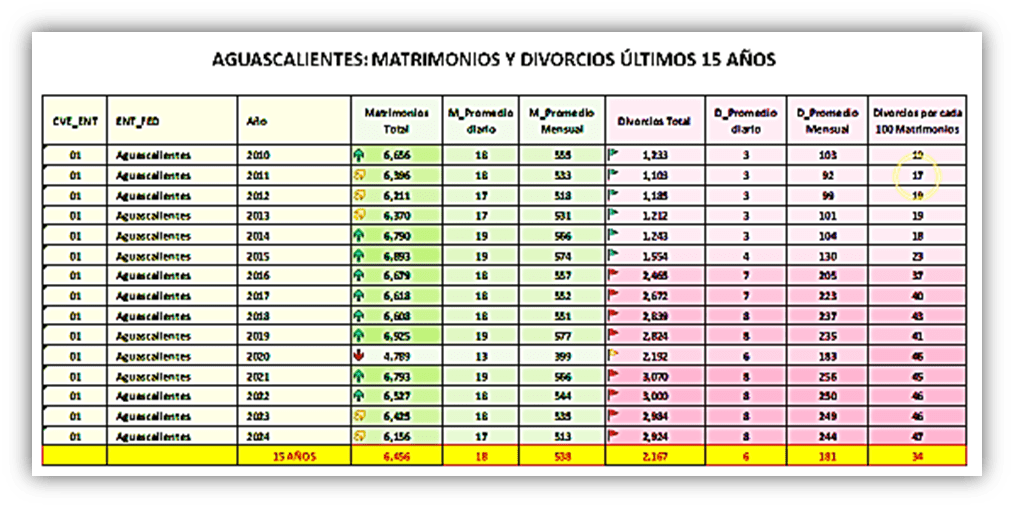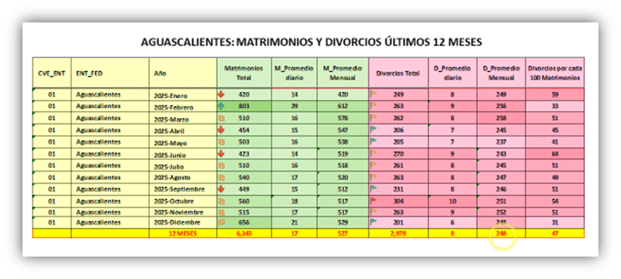 - Tasa: La tasa de divorcios fue de 3.12 por cada mil habitantes (2024), Aguascalientes ha estado ocupando el 5º o 6º lugar nacional.