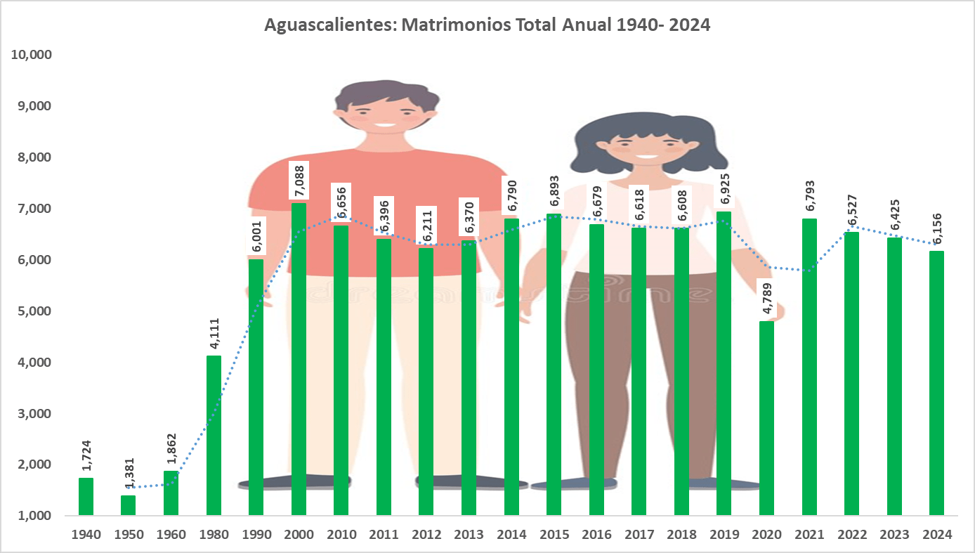 En matrimonios, el número máximo se había presentado en el año 2000 con más de 7 mil uniones. Para los últimos años, el promedio se ha estacionado en 6 mil 500, con excepción del año 2020 derivado de la pandemia.