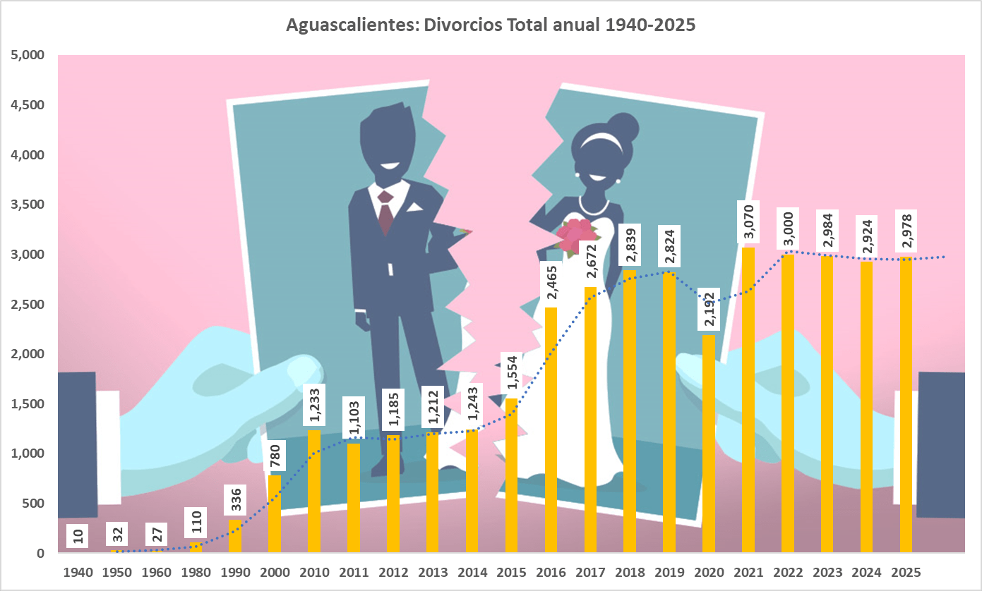 Aguascalientes registra una tasa de disolución matrimonial tal, que la sitúa entre los primeros lugares a nivel nacional. En 2024-2025, se registraron relaciones de aproximadamente de 50 a 52 divorcios por cada 100 matrimonios, con el 98% de los casos bajo la modalidad de divorcio incausado. El rango de edad al divorcio se encuentra entre los 30 y 43 años.
