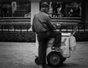 El paletero, de espaldas al ruido, sostiene una economía mínima que rara vez entra en los discursos. No promete futuro ni progreso; garantiza presencia. La organillera hace sonar una máquina que no evolucionó, pero tampoco desapareció. Su música gira como la memoria: insiste, aunque el tiempo la declare obsoleta. El artista, concentrado, entrega el cuerpo a una partitura que no busca aplauso. En su silencio hay orden, disciplina y contención.