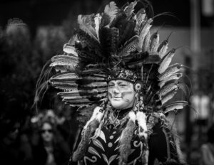 El danzante porta un rostro intervenido que no oculta identidad, la reafirma. Su cuerpo recuerda lo que la homogeneización intenta borrar.