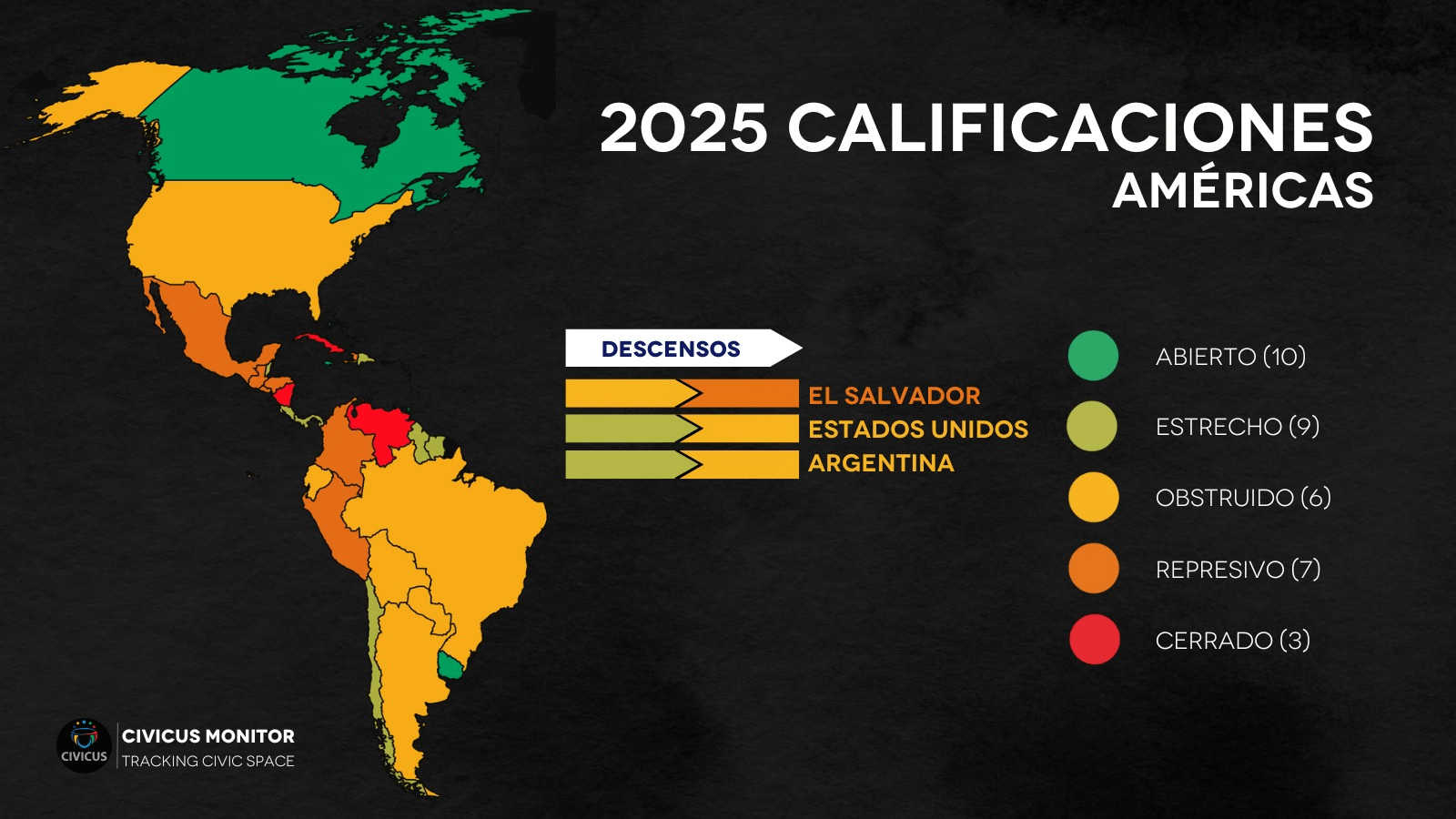 MAPA SEMAFORIZADO SOBRE EL ESPACIO CÍVICO DE LOS PAÍSES 2025