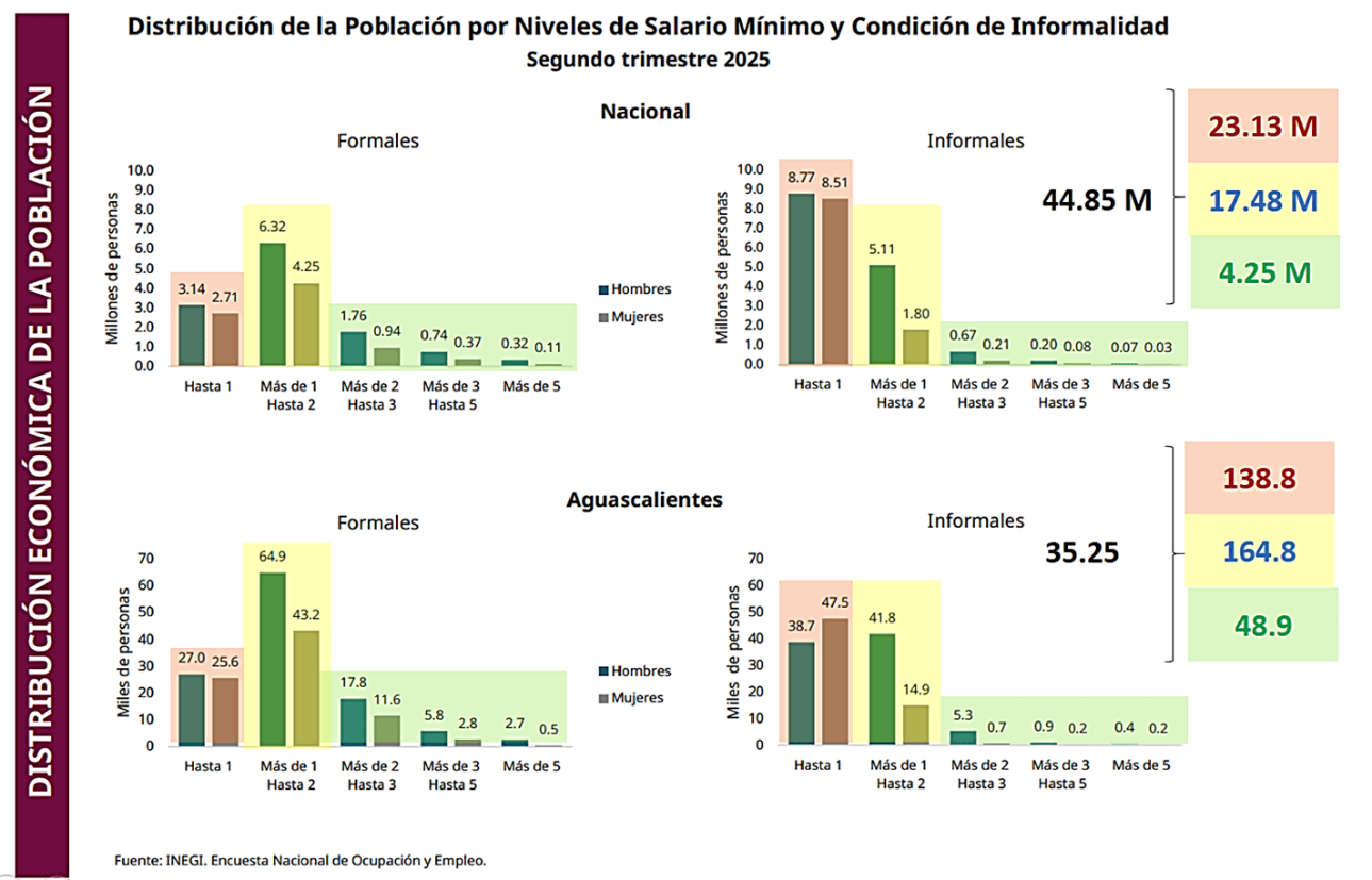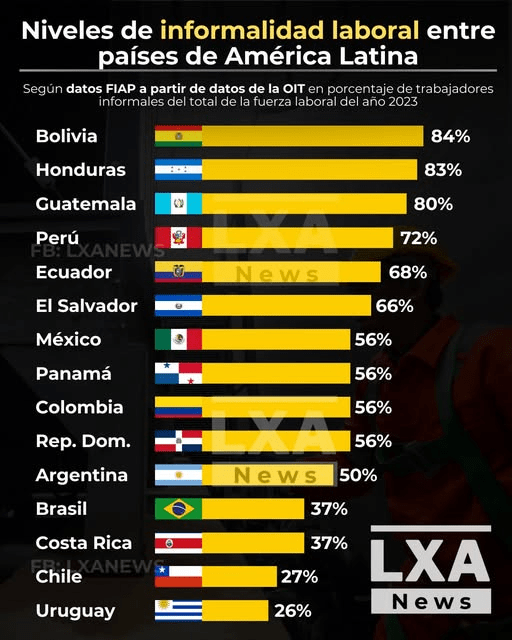 Las cifras basadas en la metodología de la OIT indican qué parte de la fuerza laboral de cada país está en empleo informal. En la parte alta aparecen Bolivia (84%), Honduras (83%) y Guatemala (80%). Luego siguen Perú (72%), Ecuador (68%) y El Salvador (66%). México aparece con 56%, en un grupo donde también se ubican Panamá, Colombia y República Dominicana con el mismo porcentaje. Del otro lado, con niveles más bajos dentro de la región, están Brasil y Costa Rica (37%), Chile (27%) y Uruguay (26%). Actualmente las cifras dan 44.8% de informalidad en México y 35.25% en Aguascalientes