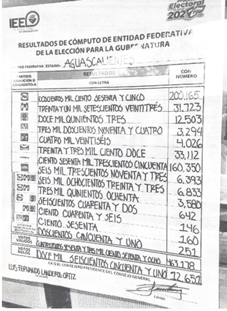 Pues bien, al jovencito le pareció inadmisible semejante comparación, sin valorar —quizás por ignorancia— que la ley de la materia obliga a desagregar los sufragios obtenidos por partido, como está asentado, por ejemplo, en la fotografía que tomé de la sábana —así le llaman— de los “Resultados de cómputo por entidad federativa de la elección para la gubernatura” 2022, firmada por el presidente del Instituto Estatal Electoral del Estado de Aguascalientes, Luis Fernando Landeros Ortiz, que se inserta al final de esta colaboración.